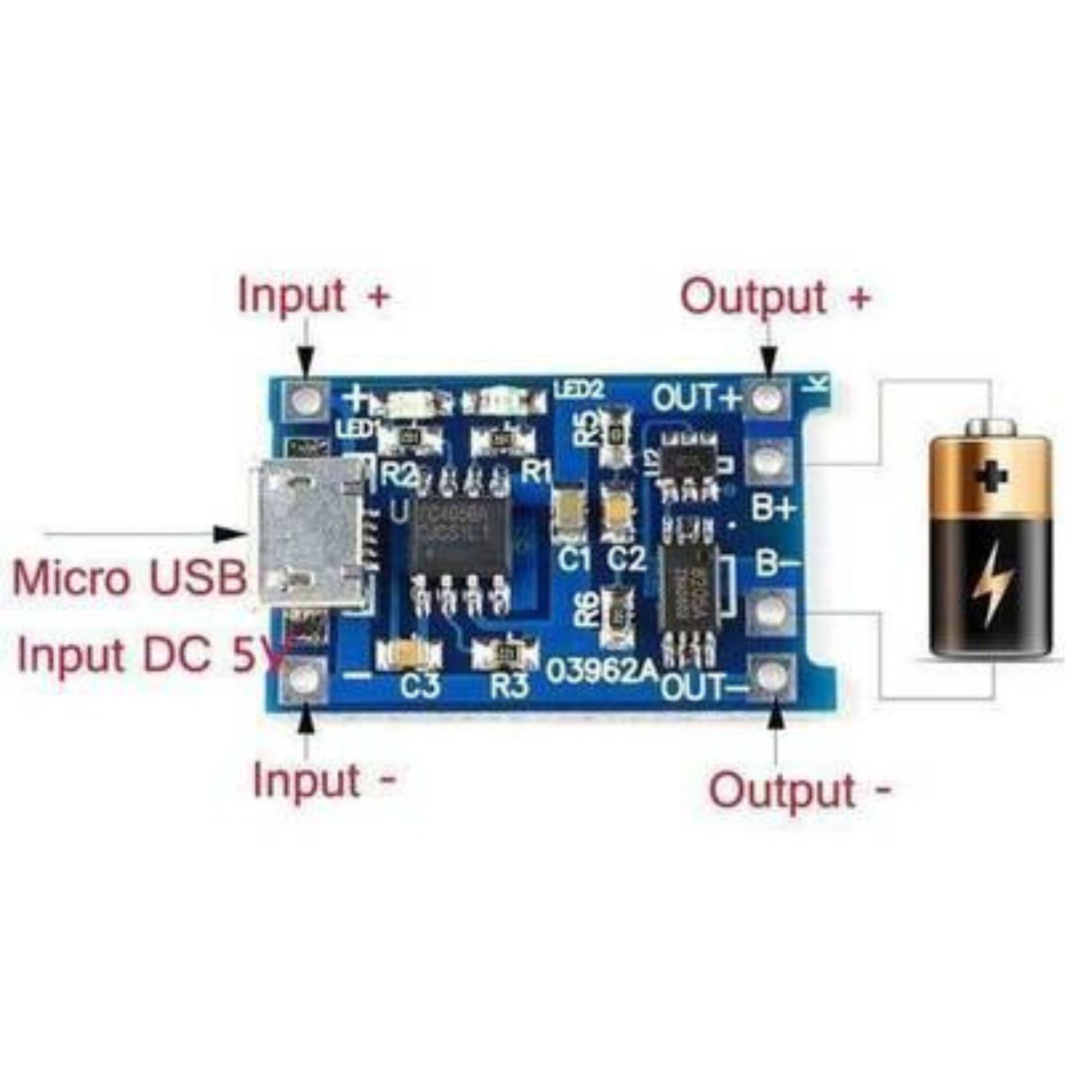 Safely recharge 3.7 V 18650 and Li‑Po cells with this TP4056 charger board. Accepts 5 V input via Micro‑USB or USB‑C, delivers up to 1 A charge current, and features built‑in over‑charge, over‑discharge, and short‑circuit protection (DW01 + 8205A). Red/blue LEDs show charging status, while tiny 25 × 19 mm PCB fits power banks, IoT gadgets, and DIY battery packs. Perfect for makers, students, and repair techs needing a reliable single‑cell charging solution.